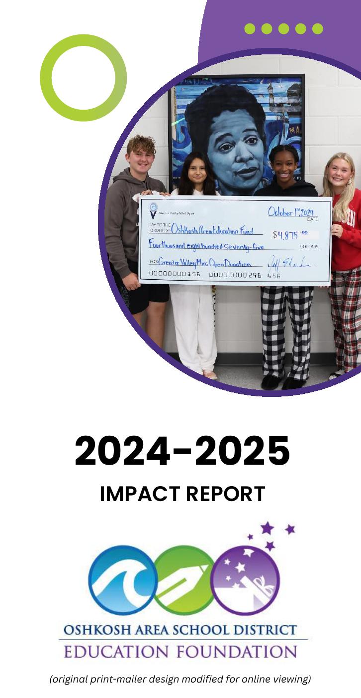 The OASD Education Foundation is proud to share its annual Impact Reports. These yearly mailers highlight the generous support of our community and the direct, measurable impact that funding has on the students and educators of the Oshkosh Area School District (OASD). Review our reports to see how your support transforms Oshkosh public education every year!
